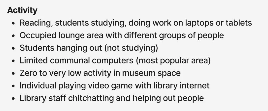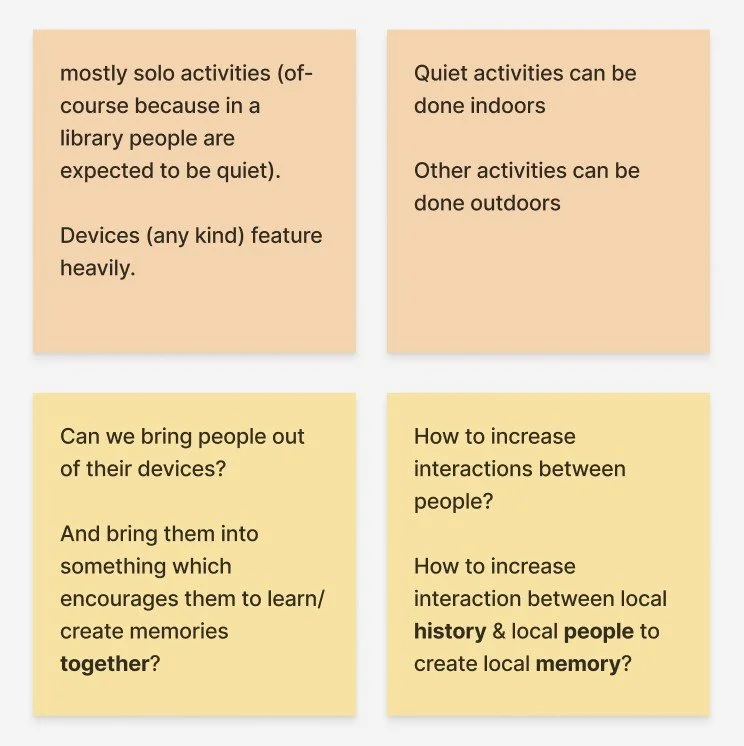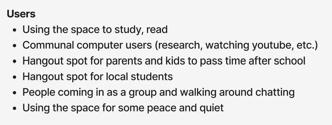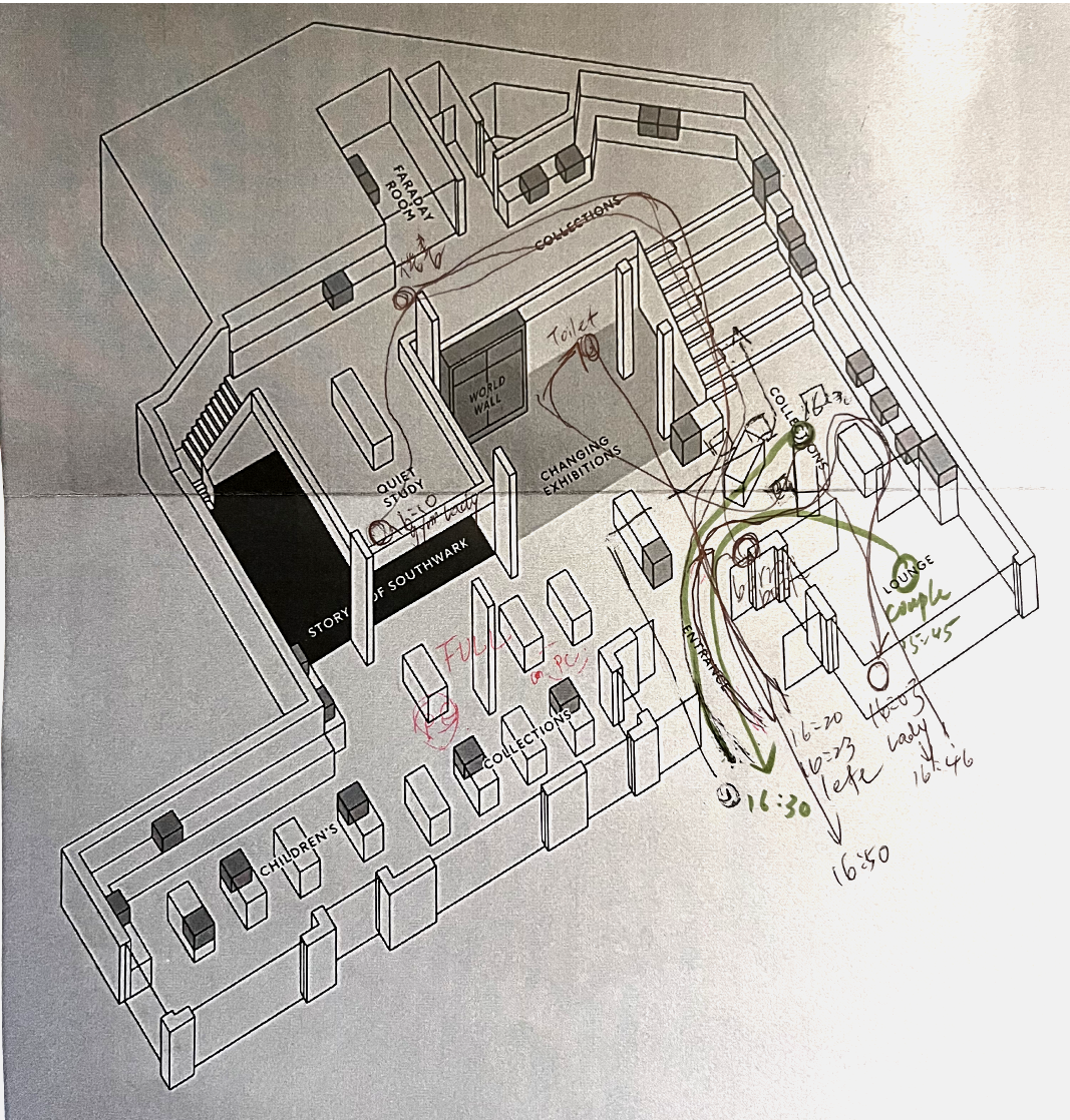 Our research began at the local Southwark Walworth Library. By observing the locals who use the library, we gained insights on how the library is being used, We discovered that most visitors primarily use the library as a workspace rather than for borrowing books or reading—they come here seeking a change of environment for their work.