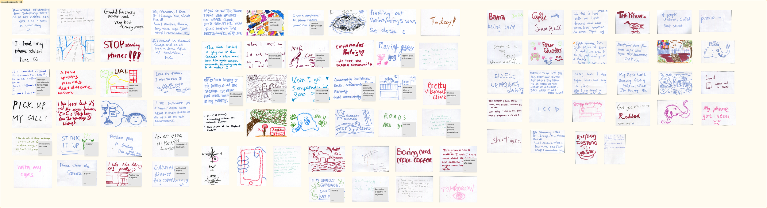 We decided to display the responses we had gathered so far. To encourage more survey participation for our final project, we placed our survey box in front of the collected postcards, creating an interaction where viewers could see the shared memories and hopefully feel inspired to leave behind one of their own.