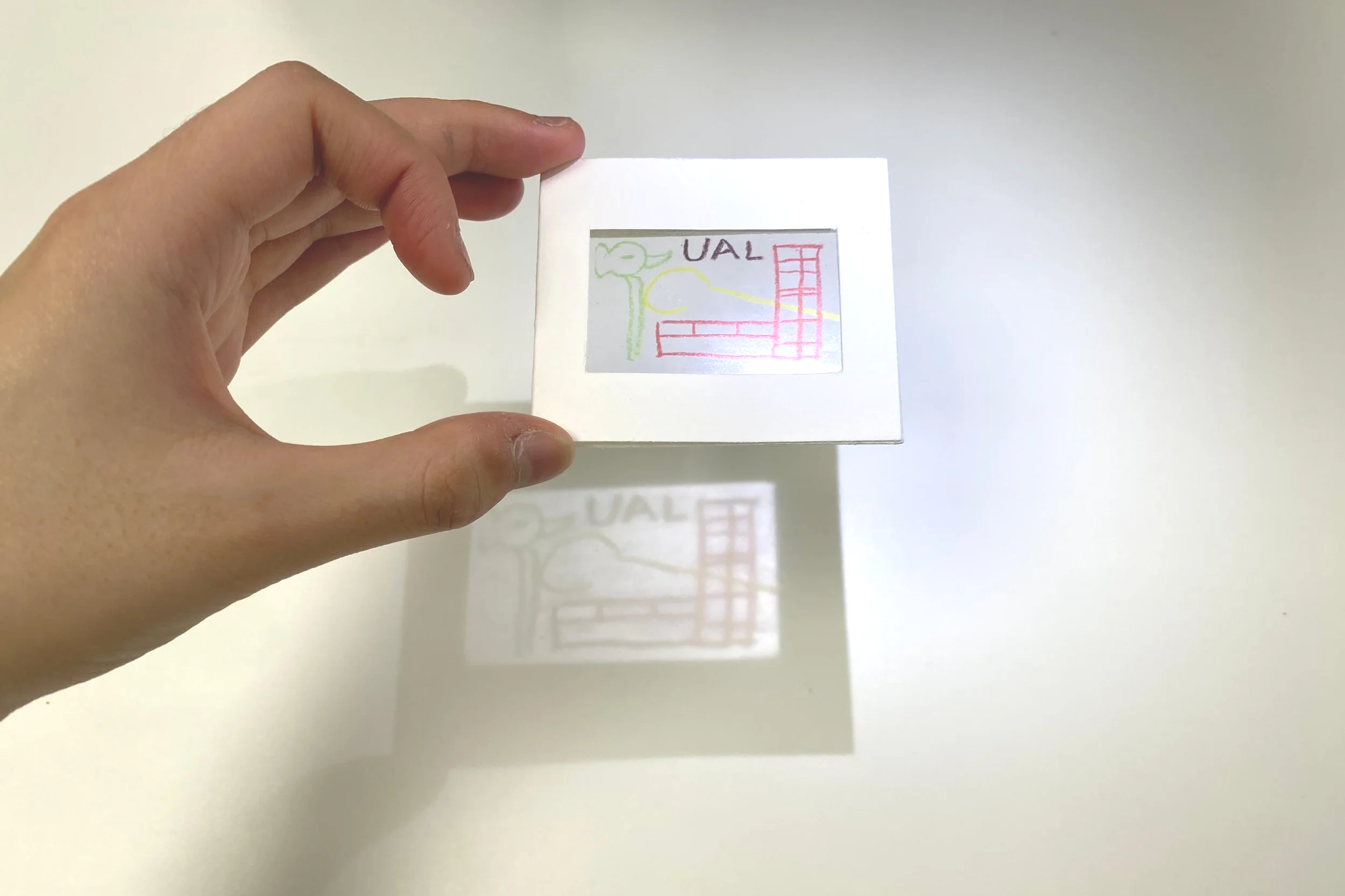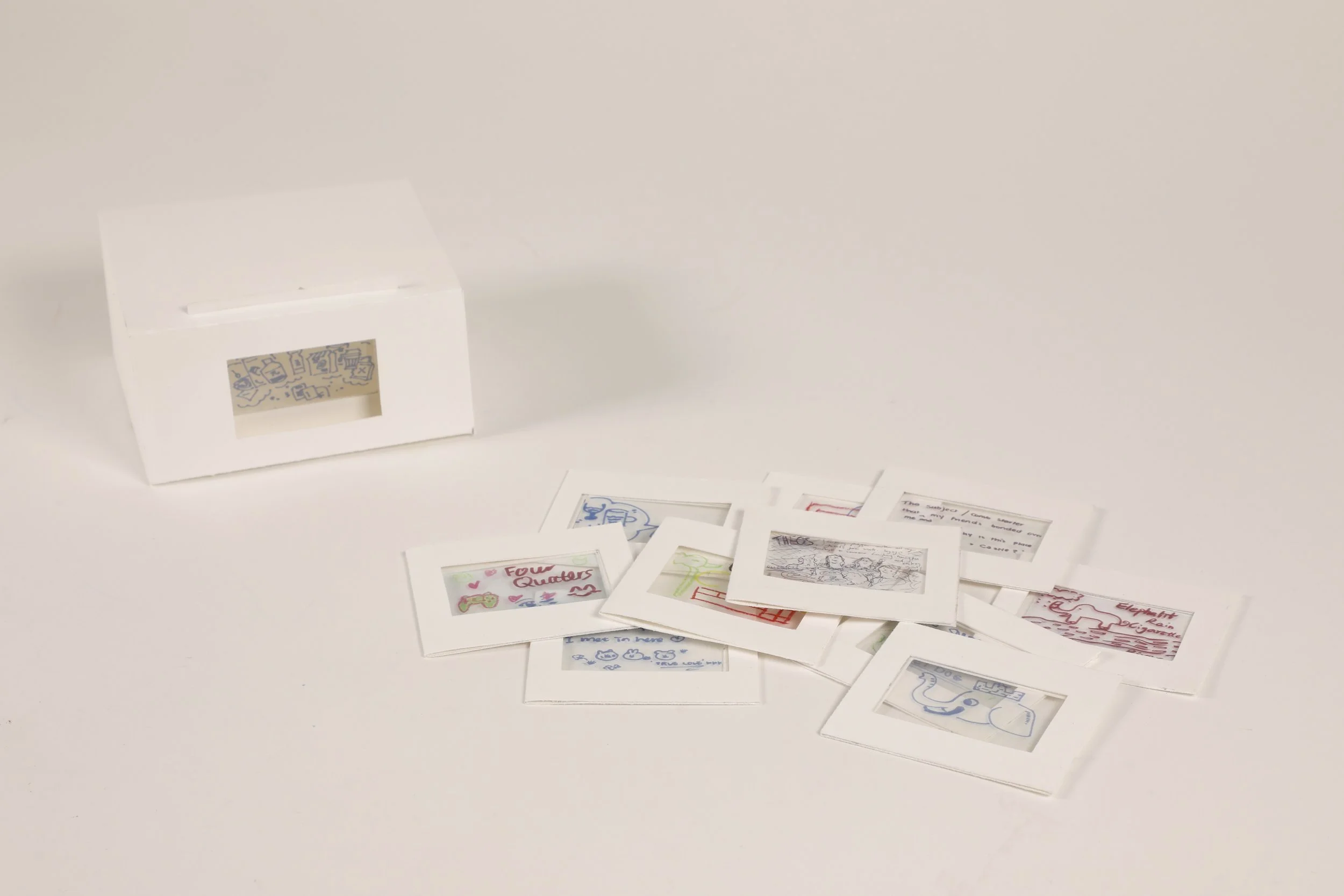 We chose not to make the memory film cards too large, so they’d be easy to carry around. Each piece of acetate is placed in the centre of a cutout paper frame, which is then folded and secured. Users can shine a light through the film card to project the memory onto a wall—or wherever they feel like.