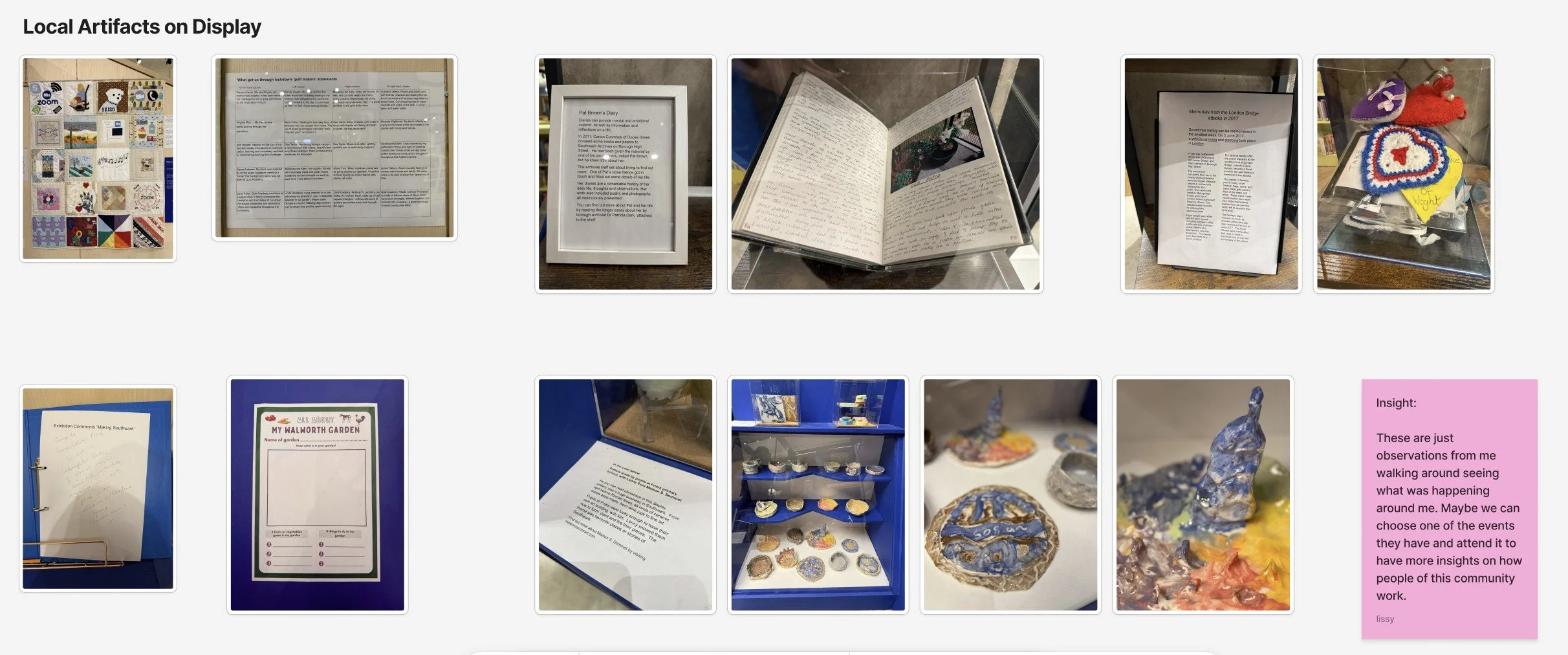 Revisiting the “What Got Us Through Lockdown Quilt” from the Southwark community, I reflected on why it stood out. The quilt captures a shared timeframe—COVID-19—where individual experiences are brought together into a collective memory. Although these moments were lived separately, they form a shared narrative the community can look back on together.