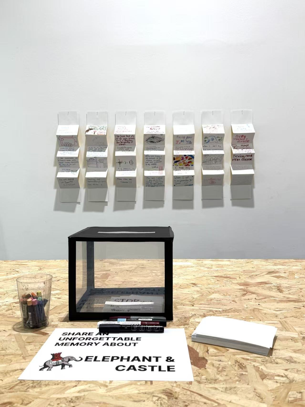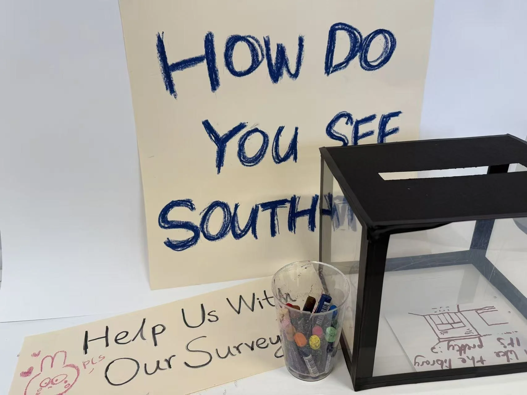 Building on our initial research, we explored low-friction ways to gather community responses. We designed a transparent survey box that made existing contributions visible, encouraging participation. Materials such as paper, pens, and crayons allowed for both written and drawn responses.