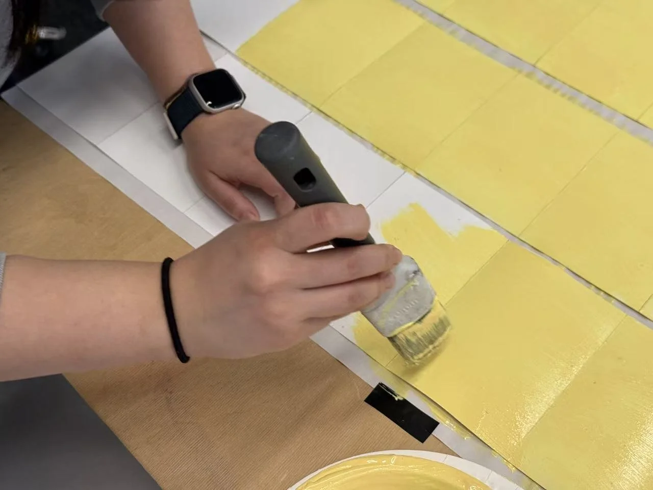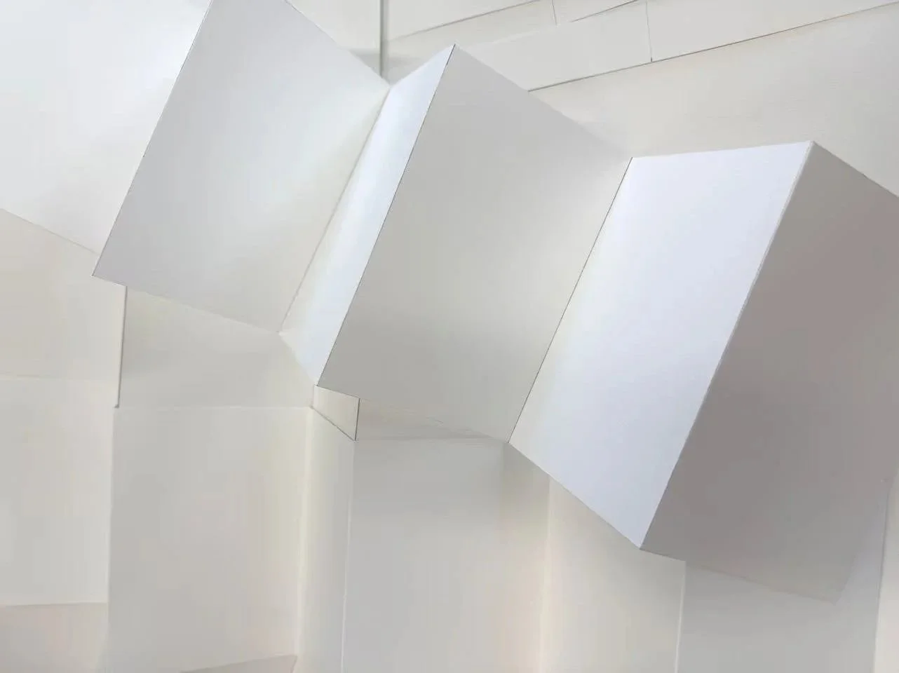 We painted the back of the paper yellow and attached the responses to accordion-folded strips. This design allowed the yellow to reflect onto the white walls, adding a subtle yet engaging visual effect.