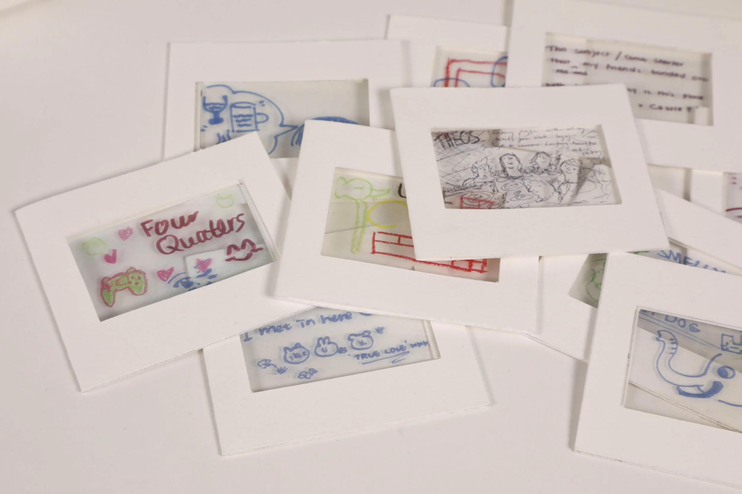 First, we scanned the written memory cards into the computer, then printed them at a smaller scale onto acetate paper and trimmed them.