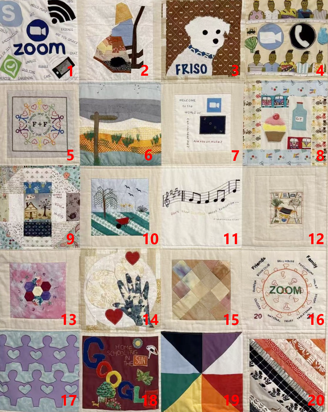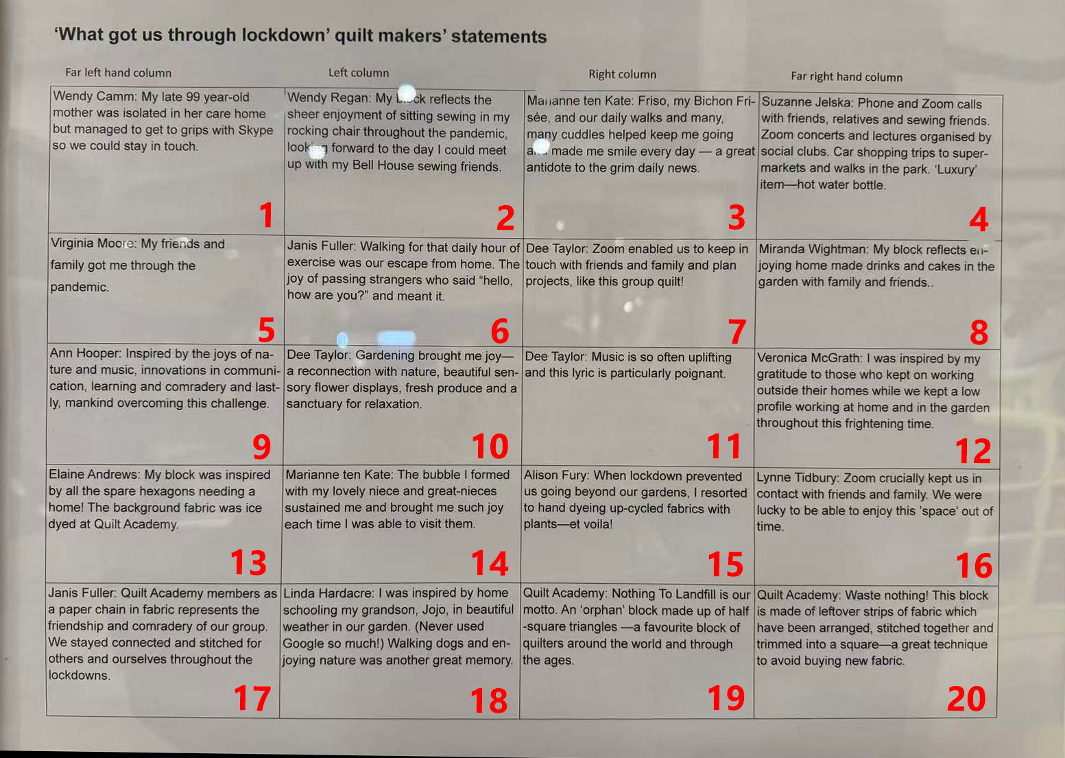 To better understand and communicate these stories, I labelled the quilt and the quilt statements, connecting each story with numbers linked to its quilt piece.